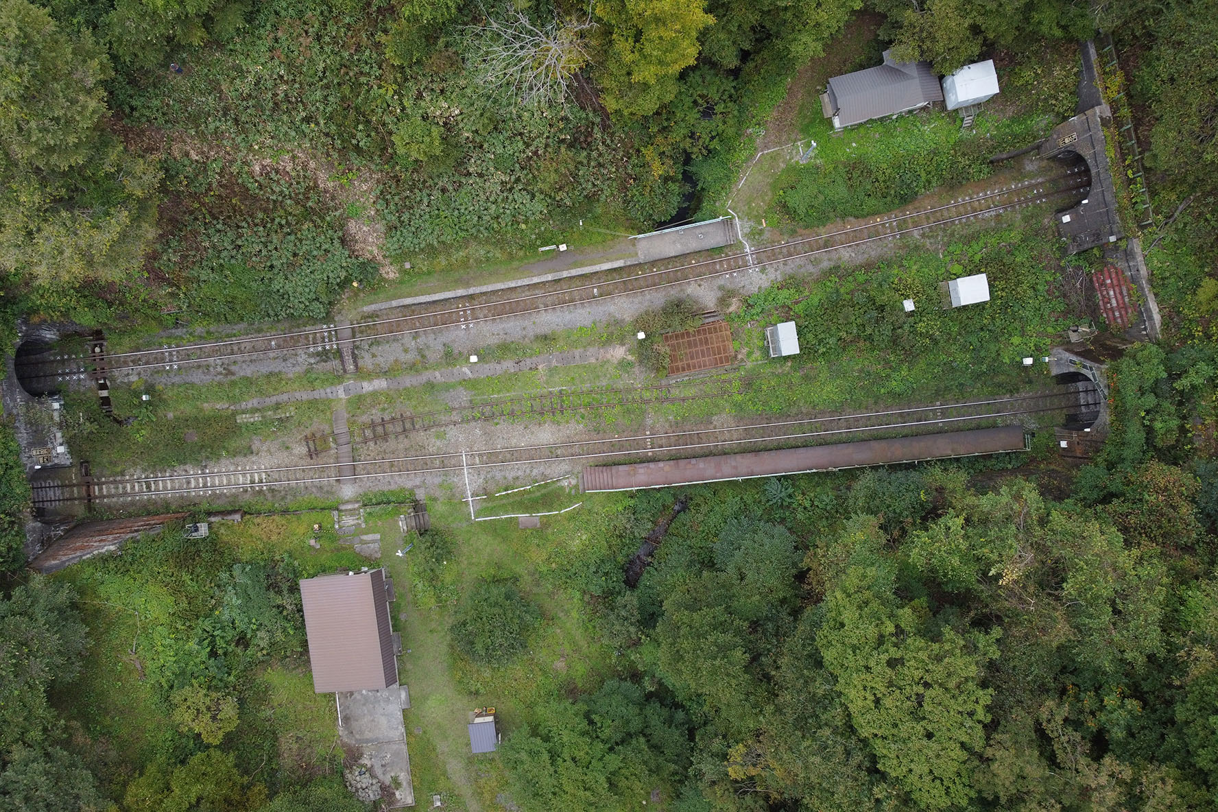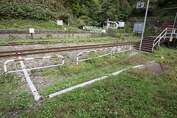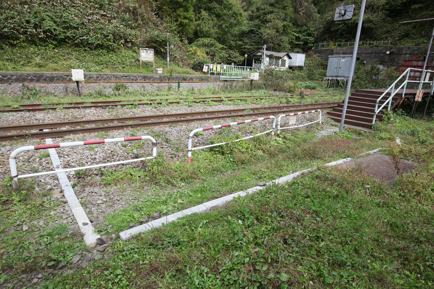 北側にも同じような埋設が増えててこんな感じ.礼文華山隧道入口のキュービクル的なところから新たな配線が出ていて,北側保線管理小屋の前で駅下沢水位監視のための既設配管と合流,ホーム脇で別れたあとに線路の下を通って南側へ,ここでふたつに別れて片方は長万部方ホームの照明類へ,他方は南側保線管理小屋前の電柱に這い上がってトイレ小屋へ.どうもこのあたりの電力配線を敷き直したようですな.長万部方ホームの駅名標の照明,電力が来なくなっていたのだけど回復したかな?