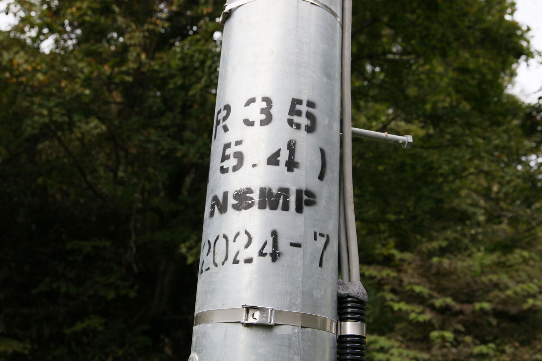 電柱.タケノコ式に高さを積み増せる構造になっているけど,一柱に一箇所だけこういうペイントが.2024 年 7 月というのは製造時期かね.工作物の建設時期考証のときには気をつけないといけませんね・・・