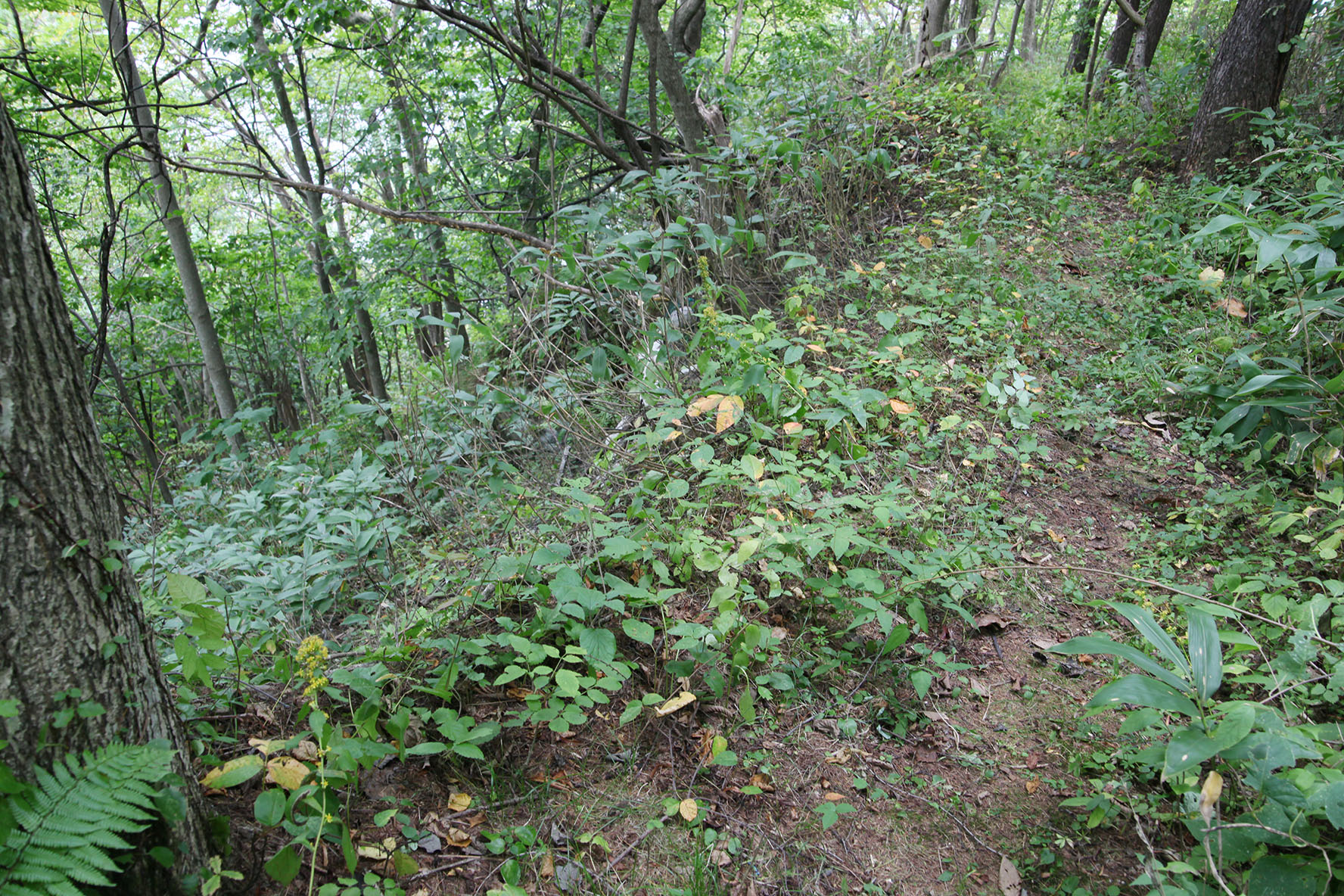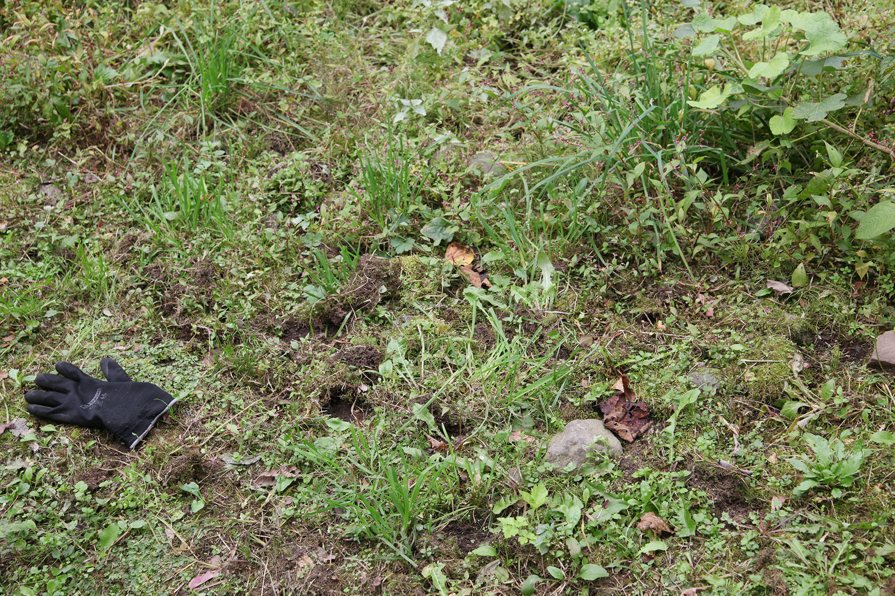 イタドリは見つけ次第,ツルハシ突き刺してできるだけ深いところの根から抜く.慈悲はない.刈るのでもダメ.確実に根から抜く.ヤマブドウも出てきていたのでできる限り地面に近いところまで引き出して伐る.慈悲はない.うまく繁茂させれば良いグランドカバーになるらしいが,当地でこいつと和解できる気がしない.