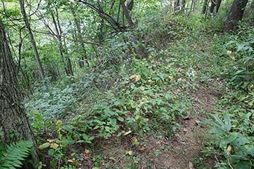 刈払の話が出たところで何かと目の敵にしているヤマブドウ.管理できるならばいろいろ利用できるようなのだけど,野良ではこうなりますという例を幌内谷の外から.丸っと茂っておりますが,ヤマブドウに寄生された木です.陽の当たるところを大きくヤマブドウに覆われてしまって,かろうじて枝をヤマブドウの覆いの外に伸ばしている状況.もちろん中の樹としてはたまったものではない.絡みつかれて変な方向に枝が伸びてしまったり引き倒されたりするし.